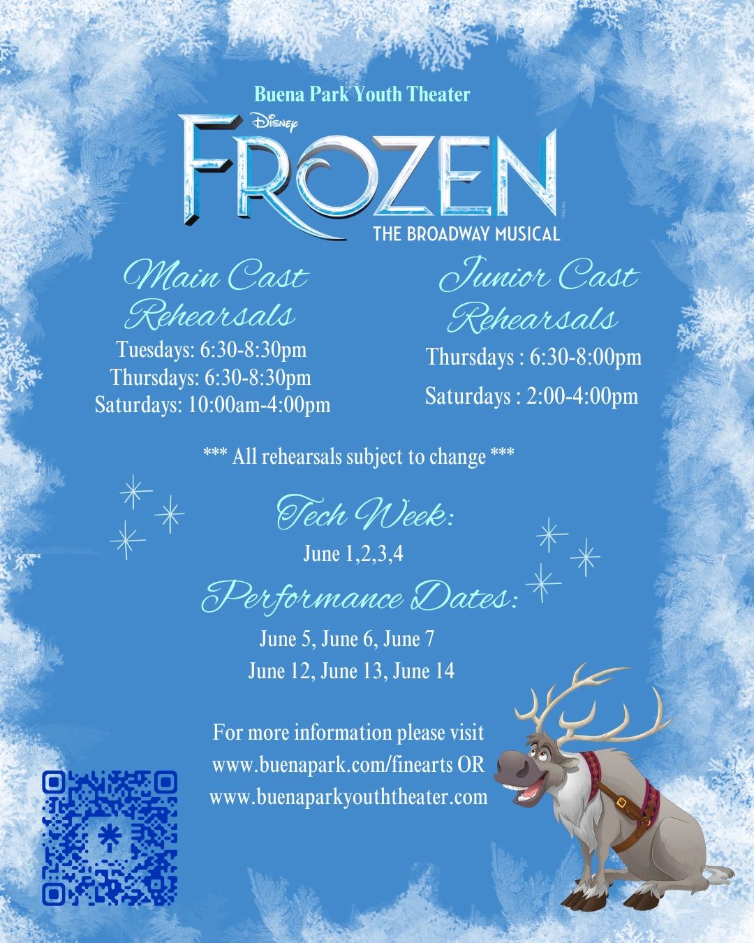 The City registration fees must be paid within 15 days of the first rehearsal. BPYT participation fees must be paid by 3/28 unless prior arrangements have been made with the Executive Production Manager. Mandatory City Main Cast Registration and Parent/Guardian/Volunteer City Registration. QR code is provided with all other codes at the mandatory first parent meeting.