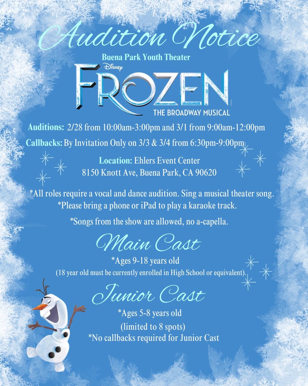 All parents/volunteers are required to fill out a release form and those 18 years of age or older who will volunteer in any way must be fingerprinted at the Buena Park Police Department. This is a city and program requirement, designed to protect all cast members. Please see the Production Team for City form. Please be advised that the City will now require that all volunteers register via the City portal.